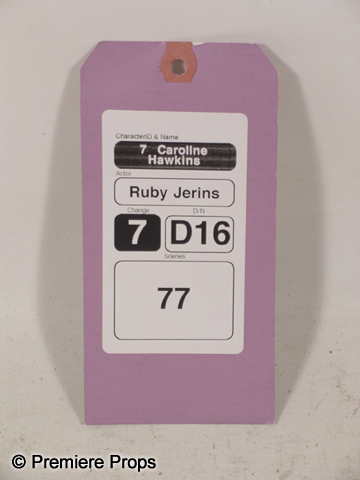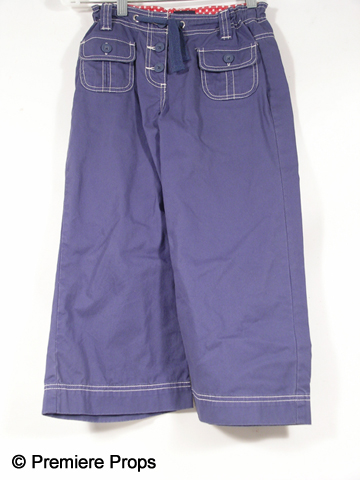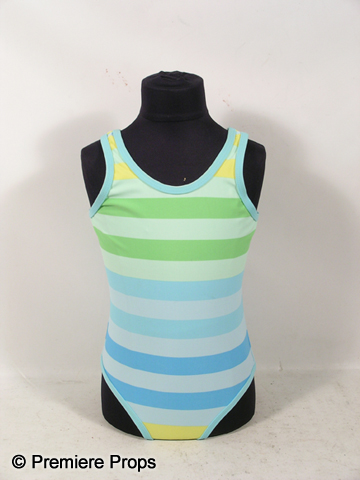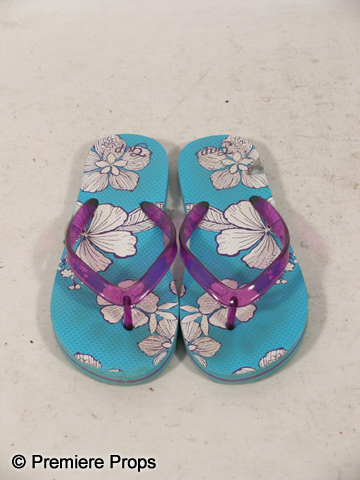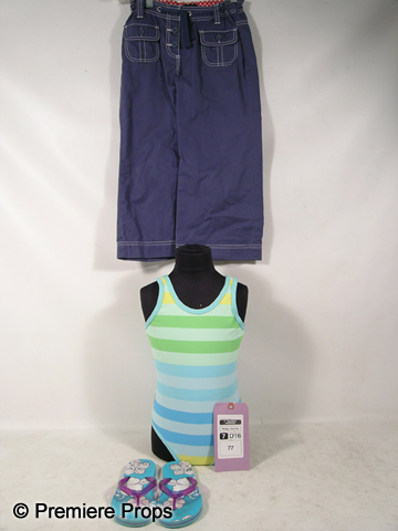 Caroline Hawkins' (Ruby Jerins) screen worn, blue, pale green, medium green, medium blue, and yellow one piece 'Old Navy' bathing suit, warm blue long shorts with white top stitch and red polka dot waist line 'Mini Boden' shorts, (size 12y) and sky blue with white flowers and purple plastic thong flip flops. Includes wardrobe tag!