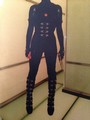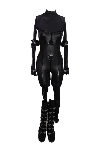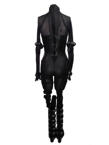 Evil goes global.From the set of Resident Evil: Retribution, this is Alice (Milla Jovovich) black neoprene suit, black spandex/black mesh cutout jumpsuit (rider stirrups) with "Umbrella Corporation" logo with black canvas like fabric body, full length zip, silver & black buckle boots & black zipper, labeled "#101 Stunt Alice" and black stretch elastic arm bands with buckles.