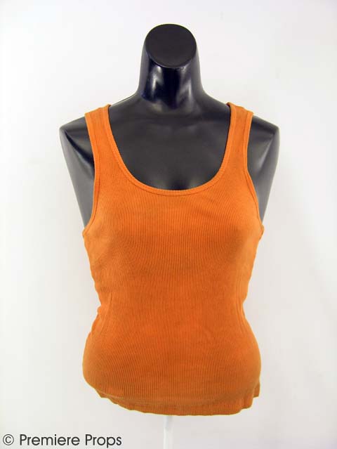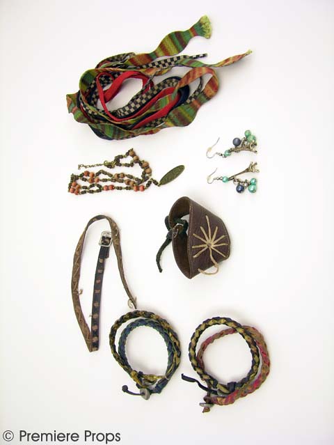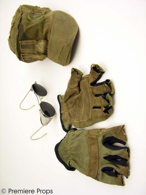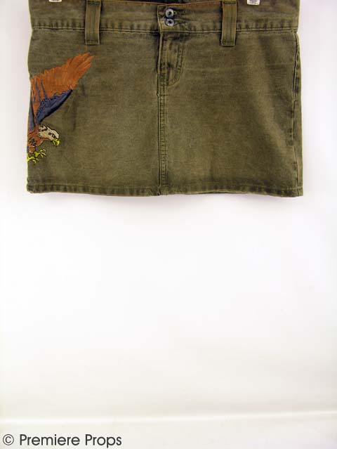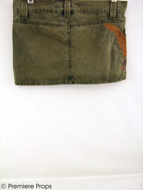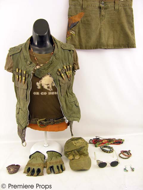 Here we have K-Mart's hero screenworn costume. Items include: an olive green zip vest with spare bullets attached. A brown "G. Girl" "Giddy Up or Go Home" t-shirt (size S). A brown leather holster. An orange "Lola" tank top (size M). An olive green eagle embroidery skirt (size 7). A olive green "Triple Five Soul" patch hat. A pair of green, tan & black fingerless gloves. A pair of sunglasses with side protection. Included are a pair of beaded Eiffel Tower earrings. A brown & red beaded necklace with a oval shaped metal charm. Five leather like wrist bands, and various colored laces & ties. Inside of most of the garments reads "K-Mart" in marker. All articles have an aged / soiled /distressed appearance made by the wardrobe team.