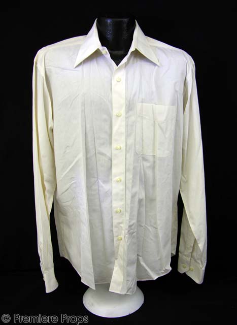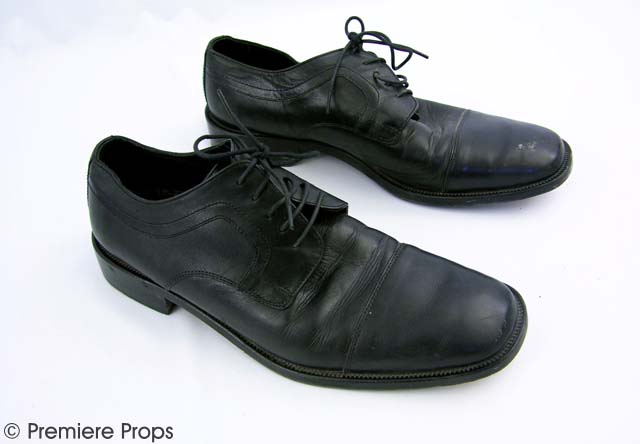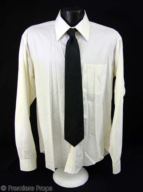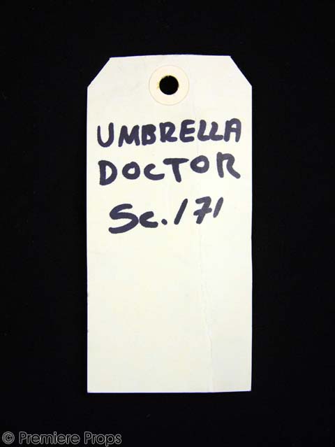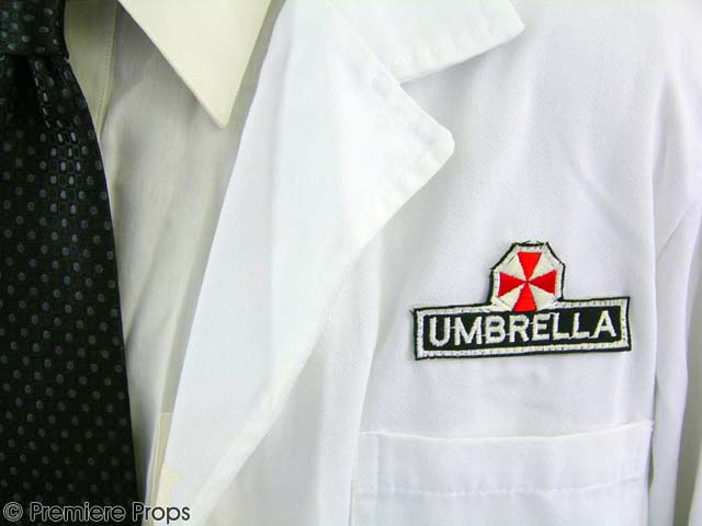 This is an Umbrella Doctor's Lab Uniform. Items include: a white lab coat with the Umbrella logo on left chest. Inside has a 4" off-white colored paint stain. A cream colored "Carven" long sleeve button up shirt (size 16.5 34/35) (inside reads "Umbrella Dr."). A black "Covington" neck tie with gray spot design (inside reads "Umbrella Dr."). A pair of gray "John Henry" dress pants (size 32/32) (inside reads "Umbrella Dr."). They are split on the back. A black leather belt (size 40-42). Also, a pair of black leather like "Stafford" lace up dress shoes(size 11) (inside reads "Umbrella Dr."). Also included is the original wardrobe department tag.