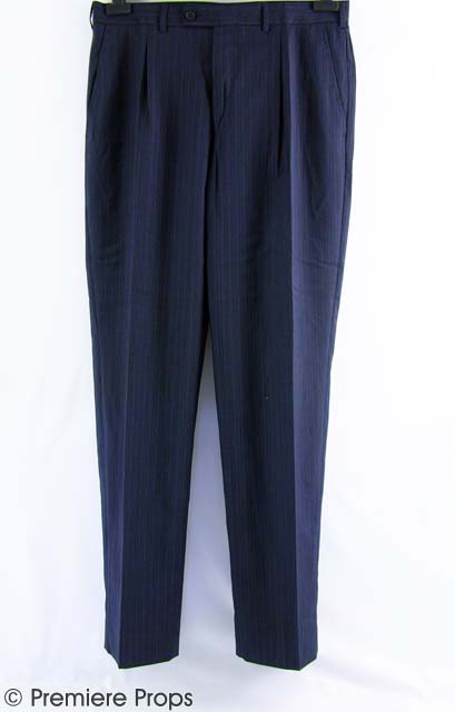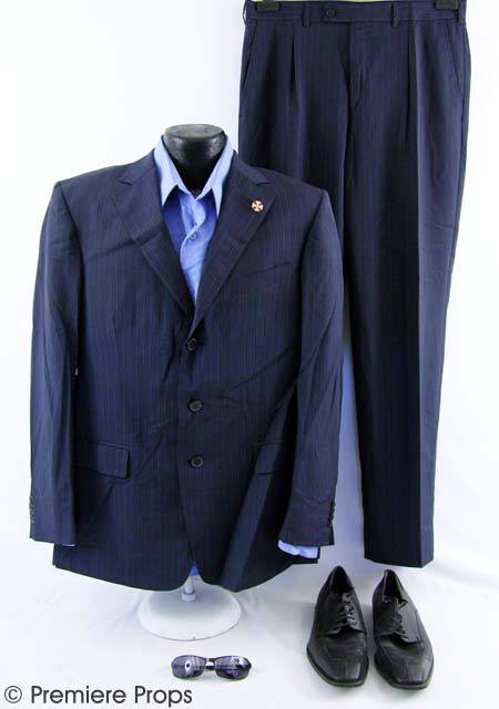 This is Wesker's screenworn costume. Items include: a navy blue "Zegna" suit with blue pin stripes. The suit is a 3 button jacket with an Umbrella pin with matching pants. A blue "John Henry"long sleeve button up shirt (size 17-34). A pair of black "Ray-Ban" sunglasses with the Ray-Ban logos removed by the wardrobe team. And lastly, a pair of black leather "Zara Man" dress shoes (size 43). Inside all articles reads "Wesker".