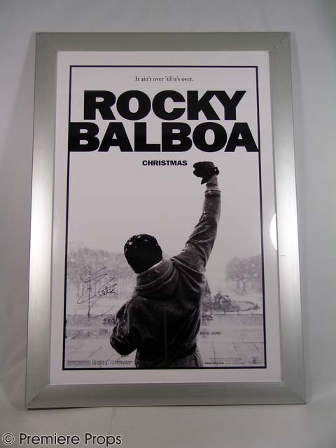 This original poster art for the new “Rocky Balboa” film is preserved in an elegant silver metal frame that measures 44 1/2” 31” and has some slight scratches. The black and white poster is authentically autographed by Sylvester Stallone in black marker, and can be hung by hooks on the back side.