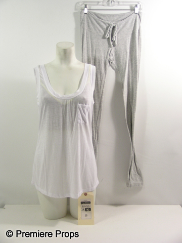 2,000 colleges. 8 million roommates. Which one will you get? Straight from the set of the hot new thriller, The Roommate, this is Sara Matthews (Minka Kelly) screen worn, hero, white burnout loose with small pocket on the left chest, low scoop neck 'Fluxus' tank top, dove grey lace with elastic bralette with triangle cups, yellow trim, thin straps 'Intimately' half top, and grey long heathered knit bootcut lounge style tie at the waist 'Alternative Earth' pants. (size S) Includes wardrobe tag!