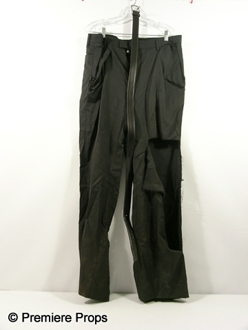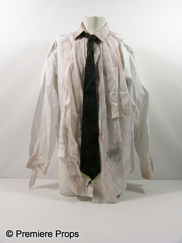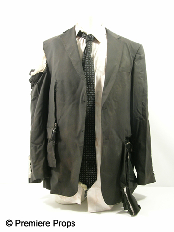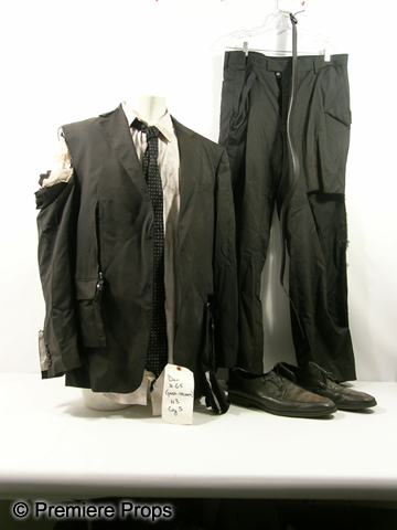 He came. He saw. They conquered. As seen in Furry Vengeance, this is Dan Sanders (Brendan Fraser) screen worn post raccoon attack, tattered and dirty two button suit jacket and pants, (size 56L, 34 pants) dirty and tattered teched cool white 100% cotton non-iron long sleeve button front 'Brooks Brothers' shirt, (size 17 1/2 - 36) tattered and dirty grey silk with circle print pattern tie, dirty white cotton 'Calvin Klein' v-neck t-shirt, (size XL) brown leather 'Coach' belt, and dirty black leather lace up with narrow toe, welted seam around the toe 'Allen Edmunds' dress shoes. (size 12D) Includes wardrobe tag!