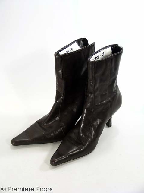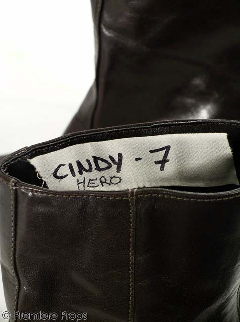 The "Aldo" dark brown heeled boots are a size 8 and have a back zip. It has a leather shell and there is scuffing. The inside has been tagged "Cindy-7 Hero" by the costume department.