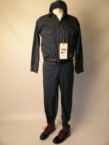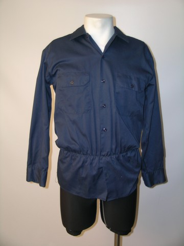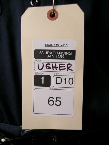 The Supernatural is coming. Bring protection. Straight from the set of Scary Movie 5, this is Ira/Dancing Janitor (Usher) screen worn, hero, dark blue long sleeve button front 'Dickies' uniform shirt with built in 'Under Armour' compression shorts, (size M) white short sleeve crew neck 'Calvin Klein' t-shirt, (size M) dark blue uniform 'Dickies' pants, (size 33 x 32) black leather belts, and black leather with red laces 'Reebok' shoes. (sie 10 1/2) Includes wardrobe tag!