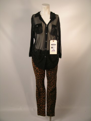 The Supernatural is coming. Bring protection. Straight from the set of Scary Movie 5, this is Kendra (Erica Ash) screen worn, hero, black sheer long sleeve two pocket button front top, black leather with metal buckle 'Michael Kors' belt, (size S) and brown and black leopard print 'Joe Jeans Wild' skinny pants. (size 28) Includes wardrobe tag!