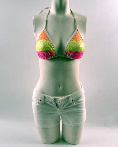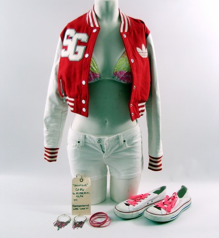 And a Whole School Full of Wild Fools From the set of School Dance, this is Jasmine (Jasmine Sanders) screen worn, hero, red with white sleeves white snap button front with red and white stripe knit with SG on the front 'Adidas' jacket, white with neon, pink, yellow, and peach sequins string 'Xhilaration' bikini top, (size S) neon, pink and gold bangles, drop hood flat hoop with dangling chains earrings, white cut off denim 'Paige' jean shorts, (size 26) and white perforated rubber toe and sole 'Converse' sneakers. (size 7) Includes wardrobe tag!