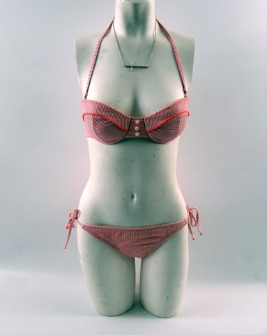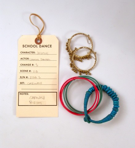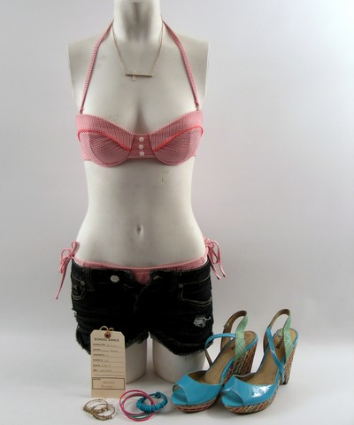 And a Whole School Full of Wild Fools From the set of School Dance, this is Jasmine (Jasmine Sanders) screen worn, hero, orange, pink, and white seer sucker with balconette bra, tie on the side and at the neck 'Xhilaration' two piece bikini, (size S) indigo wash cut off 'Mossimo' shorts, (size 5) sideways cross necklace, bracelets, and patent aqua open toe 'Unlisted' platform sandals. (size 10) Includes wardrobe tag!