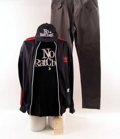 And a Whole School Full of Wild Fools From the set of School Dance, this is Julian (Julian Goins) screen worn, hero, black nylon with white stripes on the side with red logo on the front and back 'Adidas' jacket, (size M) black with No Ratchets on the front and logo on the back 'Alstyle' t-shirt, (size M) black with No Ratches on the front 'City Hunter' hat, and steel grey cotton twill 'H&M' pants. Includes wardrobe tag!