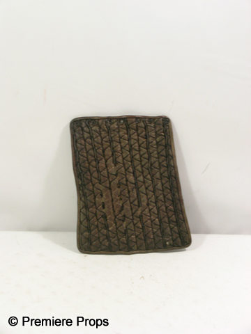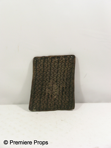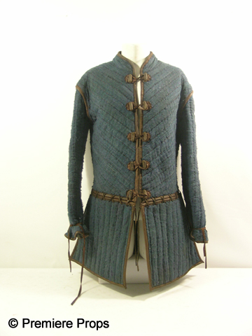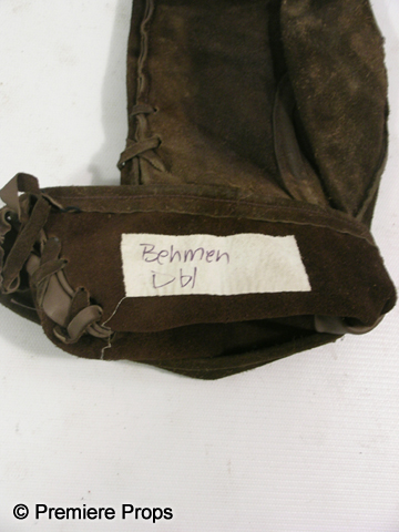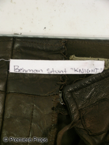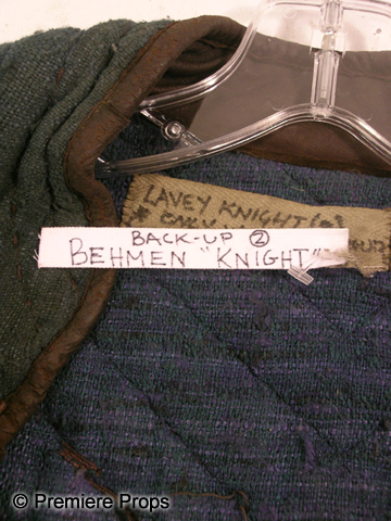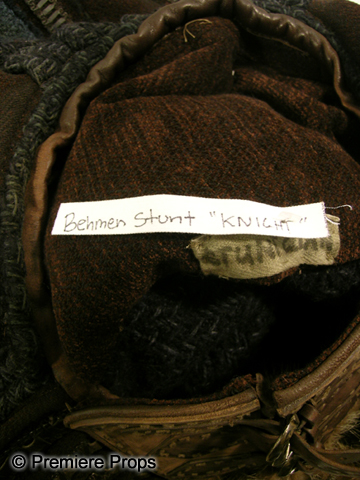 Not all souls can be saved.Straight from the set of the Fourteenth Century fantasy thriller, Season of the Witch, this is Knight Behman (Nicolas Cage) stunt, blue wool with leather detail and fur detail down the center, three leather buckles at the chest, very long hooded coat with mud from the production at the bottom, (custom made, 'Behman Knight Stunt' written inside) blue thick wool with leather outline detail, leather ties on the center front, leather ties at the wrist, custom made top, (custom made, 'Backup Behman Knight' written inside) worn brown leather with two ties on the front, black wool leggings, custom made pants with elastic at the bottom and buttons inside, (custom made, 'Behman Stunt Knight' written inside) two brown leather custom rectangular bicep armor piece from the scene prior to the wolf fight, (approx. 11" x 9" each) and brown leather with leather lacing gloves. ('Behman Double' written inside)