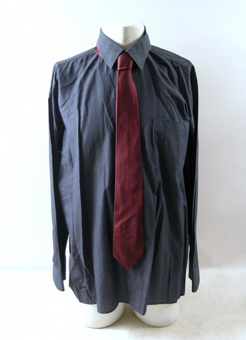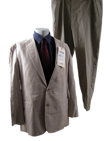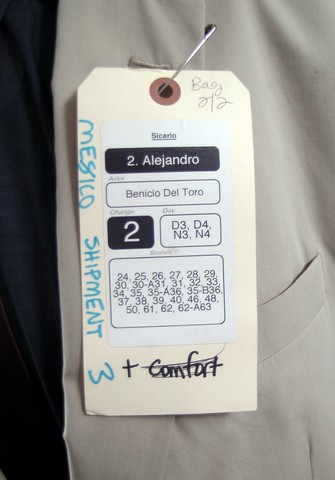 The border is just another line to cross. Direct from the set of Sicario, this is Alejandro (Benicio Del Toro) screen worn, hero, tan two button long sleeve jacket, (size 46L W41) navy blue long sleeve button front 'Anto' custom shirt, (BD July 2014 insdie the neck) shiny maroon neck tie, and khaki flat front 'Brooks Brothers' pants. (size 40) Includes wardrobe tag.
