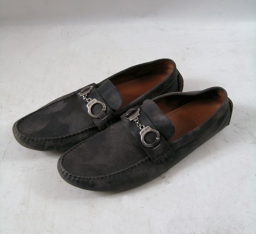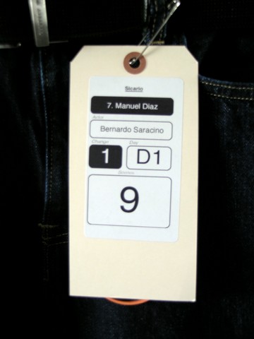 The border is just another line to cross. Direct from the set of Sicario, this is Manuel Diaz (Bernardo P. Saracino) screen worn, hero, light blue with Moroccan print long sleeve button front with checker detail at the neck 'Thomas Dean' shirt, (size M) black and brown leather with metal silver colored buckle 'Geoffrey Beene' belt, (size 36) dark wash denim 'J. Crew' jeans, (size 34 x 34) and grey suede with handcuff decoration on top 'Jimmy Choo' loafers. (size 46) Includes wardrobe tag.