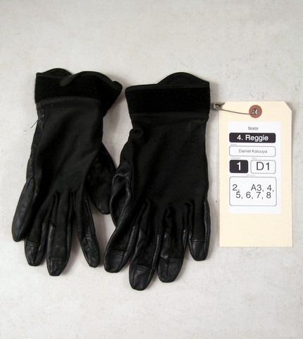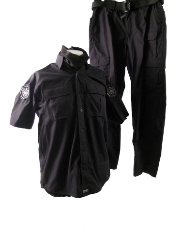 The border is just another line to cross. Direct from the set of Sicario, this is Reggie (Daniel Kaluuya) screen worn, hero, black short sleeve button front with patches on the sleeve and pockets on the front 'Blackhawk' tactical Swat shirt, (size M) black long sleeve crew neck 'Gap' shirt, (size L) black neck gator, black tactical gloves, black webbed plastic slide through 'Propper' belt, (size 36) and black with multiple pockets '511' tactical pants. (size 34/32) Includes wardrobe tag.