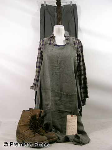 Some will kill to have it. He will kill to protect it.As seen in the new action thriller, The Book of Eli, this is Solara (Mila Kunis) screen worn, hero, dirty gray with pockets in the front apron, blue and tan plaid flannel, button front long sleeve with collar, two front pockets, 'Twenty One' shirt, (size M) long sleeve crew neck 'BDG' thermal shirt, (size S) dirty, grey 'Gap' straight leg pants, (size 1) brown leather belt, (size M) and arged dirty, brown leather, high top, 'Ad Tec' work boots. (size 7 Mens) Includes wardrobe tag!