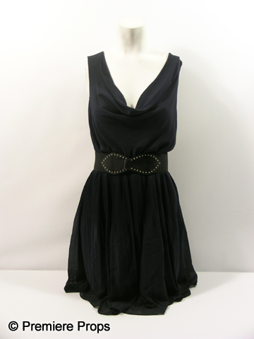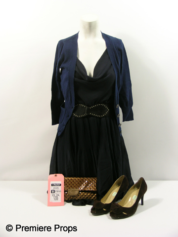 It's a thin line between love and friendship. Straight from the set of the new romantic comedy, Something Borrowed, this is Rachel (Ginnifer Goodwin) screen worn, navy sleeveless chiffon draped at the neck, 'Baby Blue Line' dress, (no size) black elastic with leather closure belt, midnight blue three quarter sleeves four button front open 'Pink Rose' cardigan, (no size) brown quilt envelope style 'Jessica McClintock' purse, and brown fake suede knob peep toe 'Milk & Honey' shoes. (size 38) Includes wardrobe tag!