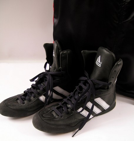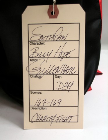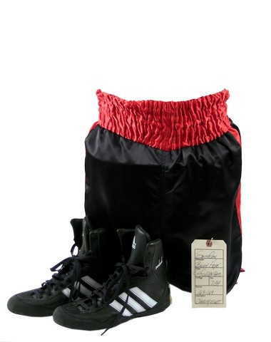 Believe in Hope. Direct from the set of Southpaw, this is Billy Hope (Jake Gyllenhaal) screen worn, hero, black with red trim 'Title' boxing shorts, (size M) black 'Cleto Reyes' groin protection belt, (size L) and black leather with white stripes 'Adidas' probout boxing shoes. (size 8 1/2) Includes wardrobe tag.