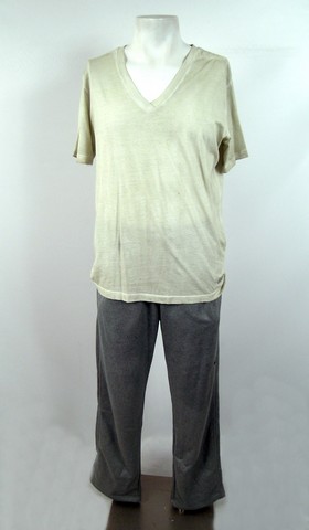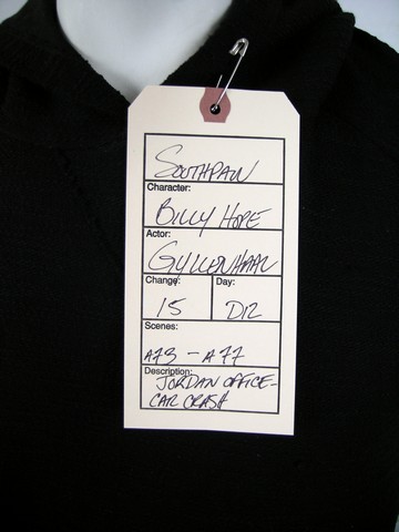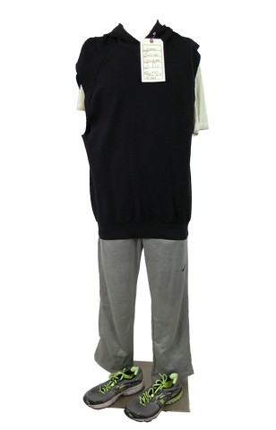 Believe in Hope. Direct from the set of Southpaw, this is Billy Hope's (Jake Gyllenhaal) screen worn, black cut off 'Zara Man' hooded sweatshirt, (size M) worn off-white v-neck short sleeve 'Diesel' t-shirt, (size L) grey 'Nike' sweatpants, (size M) and worn grey and neon green lace up the front 'Ravenna' shoes. (size 11) Includes wardrobe tag.