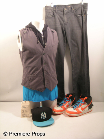 One step can change your world. Direct from the set of Step Up Revolution, this is Jason (Stephen Boss AKA Twitch) screen worn, hero, grey 'Guess' vest with black hoodie attached top, (size L) turquoise 'Neon' tank top, (size M) black and teal 'New Era' Yankees hat, (size 7 5/8) dark grey denim 'Citizen of Humanity' jeans, (size 34) and white, orange, and teal 'Nike' shoes. (size 12) Includes wardrobe tag!