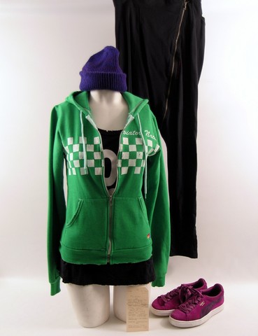 Every Step Has Led To This Direct from the set of Step Up All In, this is Jenny Kido (Mari Koda) screen worn, hero, green with logo on the front and back zipper front with hood 'Aviator Nation' sweatshirt, black with cut off sleeves logo on the front 'Petals and Peacocks' t-shirt, purple knit cap, stretch black with zipper 'Nappy Tabs' pants, and purple suede and rubber 'Puma' shoes. Includes wardrobe tag!