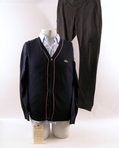 Every Step Has Led To This Direct from the set of Step Up All In, this is Moose (Adam G. Sevani) screen worn, hero, navy v-neck with buttons on the front 'Lacoste' cardigan sweater, (size 4) pale blue long sleeve button front 'Lacoste' dress shirt, (size 36) and grey chino 'French Connection' pants. (size 28) Includes wardrobe tag!
