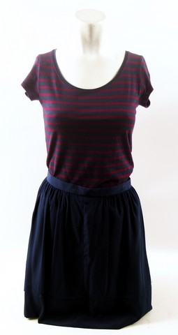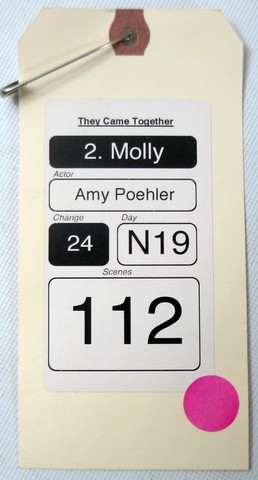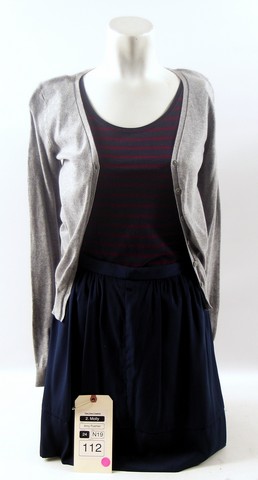 He came...She came...They both came.Direct from the set of They Came Together, this is Molly (Amy Poehler) screen worn, hero, grey long sleeve button front v-neck 'H&M' cardigan sweater, (size 4) navy and purple horizontal stripe short sleeve 'H&M' shirt, and navy short full 'Uniqlo' skirt. (size 4) Includes wardrobe tag!