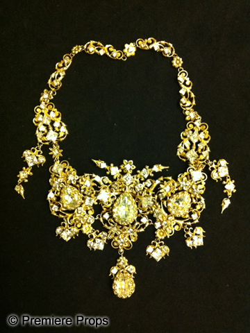 Every legend has a new beginning. Direct from the set of Three Musketeers, this is Queen (Juno Temple) screen worn, hero, faux gold with intricate detail, faux diamonds encrusted throughout necklace. (approx. 17 1/2" long) This is a very key prop from the film.