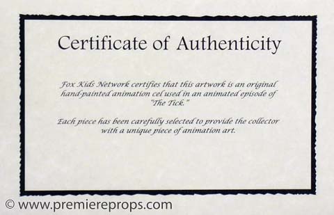 This is an original production cel featuring the Tick and Arthur covered in mud. It measures 12.5" x 10.5" and includes a Certificate of Authenticity from "Fox Kids Network!" This cel is not matted.