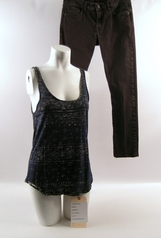 Yesterday Dr. Will Caster was only human Straight from the set of Transcendence, this is Bree (Kate Mara) screen worn, hero, navy blue low scoop neck with cream batik horizontal pattern sleeveless tank top, (size L) and black stretch denim 'Civilianaire jeans. (size 27) Includes wardrobe tag!