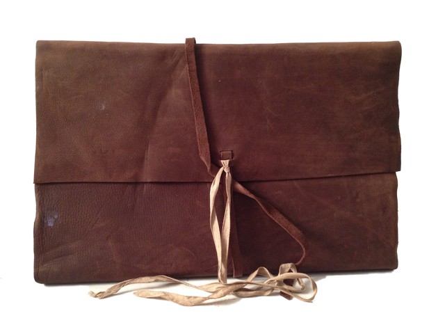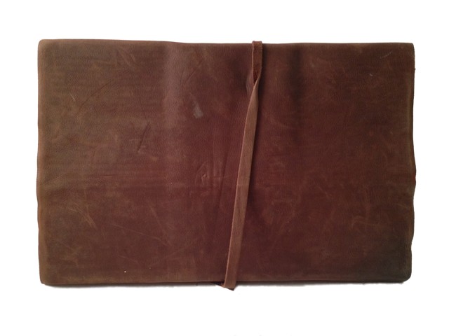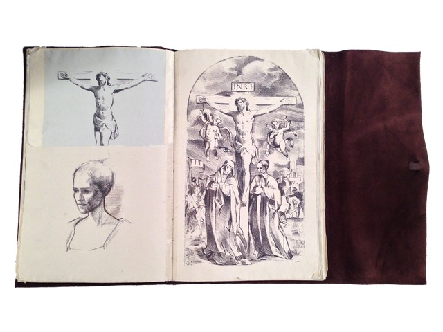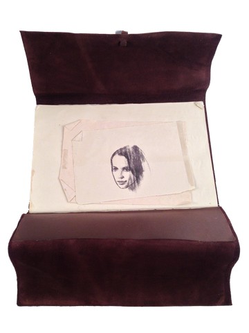 Desire. Obsession. Betrayal. Straight from the set of Tulip Fever, this is Jan Van Loos (Dane De Haan), screen used, hero, brown leather sketchbook with two loose sketches of Sophia (Alicia Vikander), as well as a couple of sketches of the crucifixion, on heavy parchment type paper. A majority of the pages are blank. (17"x12"x1").