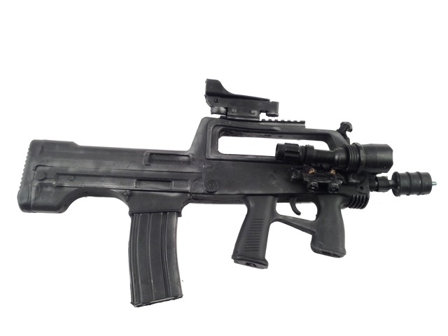 Every War Has A Beginning From the set of Underworld: Awakening, this is SWAT Guard screen used, black Type 97 Machine Gun, made from solid rubber. Front tip is missing, scope is slightly bent, and the ironsight is torn and loose. Includes attached, non-removal rubber flashlight that is torn and loose. This is a prop only and cannot be made to fire in any way. (approx. measures 24" x 13")