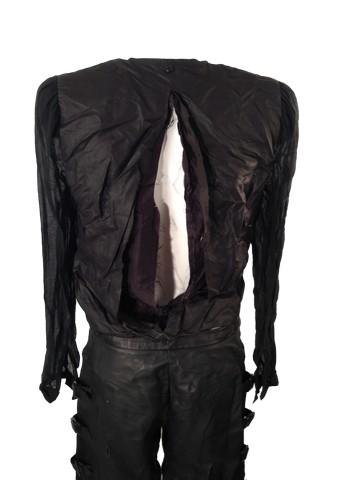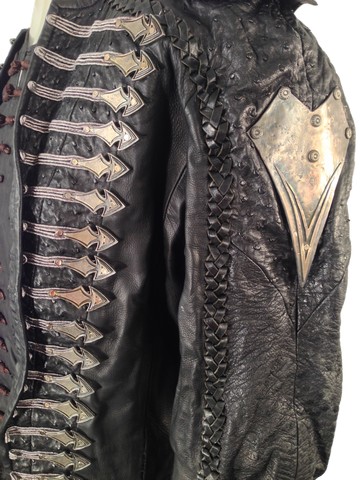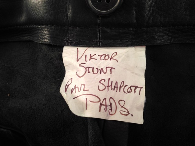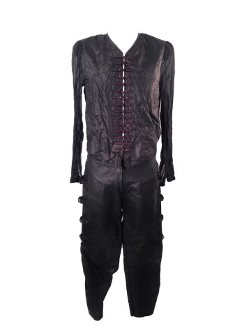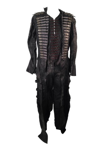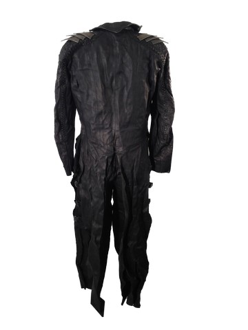 Every war has a beginning. From the set of Underworld: Rise of the Lycans, this is Viktor (Bill Nighy) screen used, stunt, heavy black leather overcoat with rusty bronze colored metal adornment on the shoulders and along the button line and leather braiding throughout, leather pants with buckles on the side and zipper in front, and polyester undershirt with string button clasps. There is a large tear in the back of the shirt. The character name is written into the pant's tag.