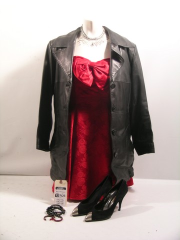 We are infinite. A screen worn, hero outfit that is seen on Mary Elizabeth, the character portrayed by Mae Whitman in the charming 2012 film, 'The Perks of Being a Wallflower'. This costume comes complete with a black leather button front 'Pelle Studio' jacket, (size XS) red zipper in the back with bow on the front vintage dress, multiple bracelets, earrings, and black suede 'Sacha London' pointed toe heels. This outfit also includes a wardrobe tag!