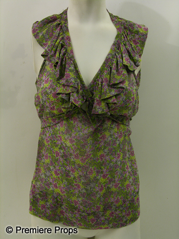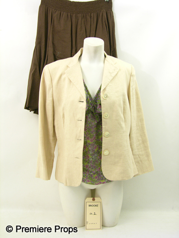 Be Your Own HeroDirect from the set of Drew Barrymore's directorial debut, this is Brooke Cavendar's (Marcia Gay Harden) screen worn purple, pink, white, and yellow floral print all over, sleeveless ruffled neck line v-neck "Fei" shirt, (size 10) champagne linen single breasted 4 button "Ralph Lauren" blazer, (size 10) and brown cotton, wide smocked waistband very full with gores "fei" skirt. (Size m) Includes wardrobe tag!